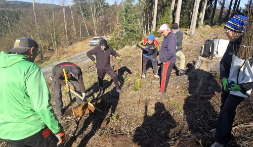 Der schlagkräftigere Mannschaftsteil nahm diesmal die Pflanzhacke zur Hand und pflanzten bei teils schwierigen Bodenverhältnissen nahe der ‚Zschimmerhöhe‘ im Zschopautal Sträucher zur Mehrung der Lebensraumvielfalt, gleich am Waldrand oberhalb des Wanderweges. So werden dort zukünftig u.a. Kornelkirsche und Schlehe wachsen, ihre Blütenpracht entfalten und Früchte tragen. Manch Teilnehmer wird sicher einmal wieder am Pflanzort vorbeischauen, ob das Werk gelungen ist – schließlich galt die Prämisse ‚Qualität vor Menge‘.